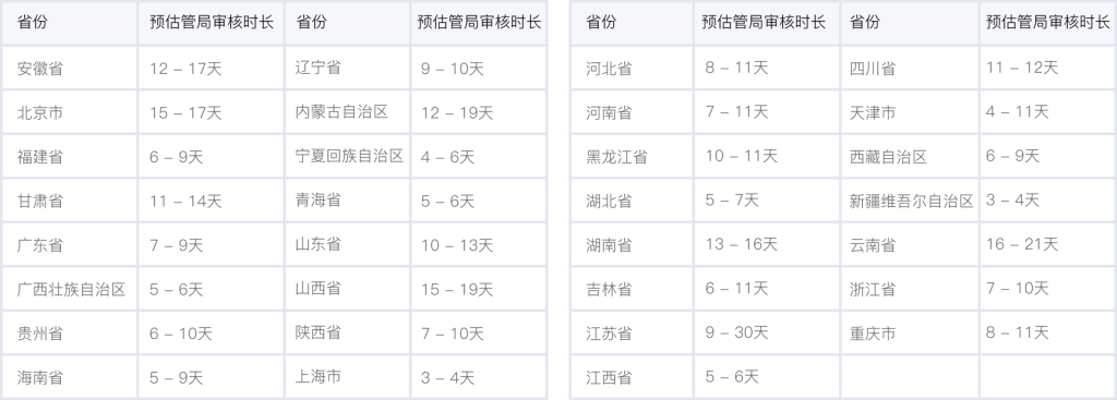 各個省管局預計審核時長,實際審核時長會根據(jù)備案場景有所不同,下表格僅供參考。詳情可查看 詳細規(guī)則。